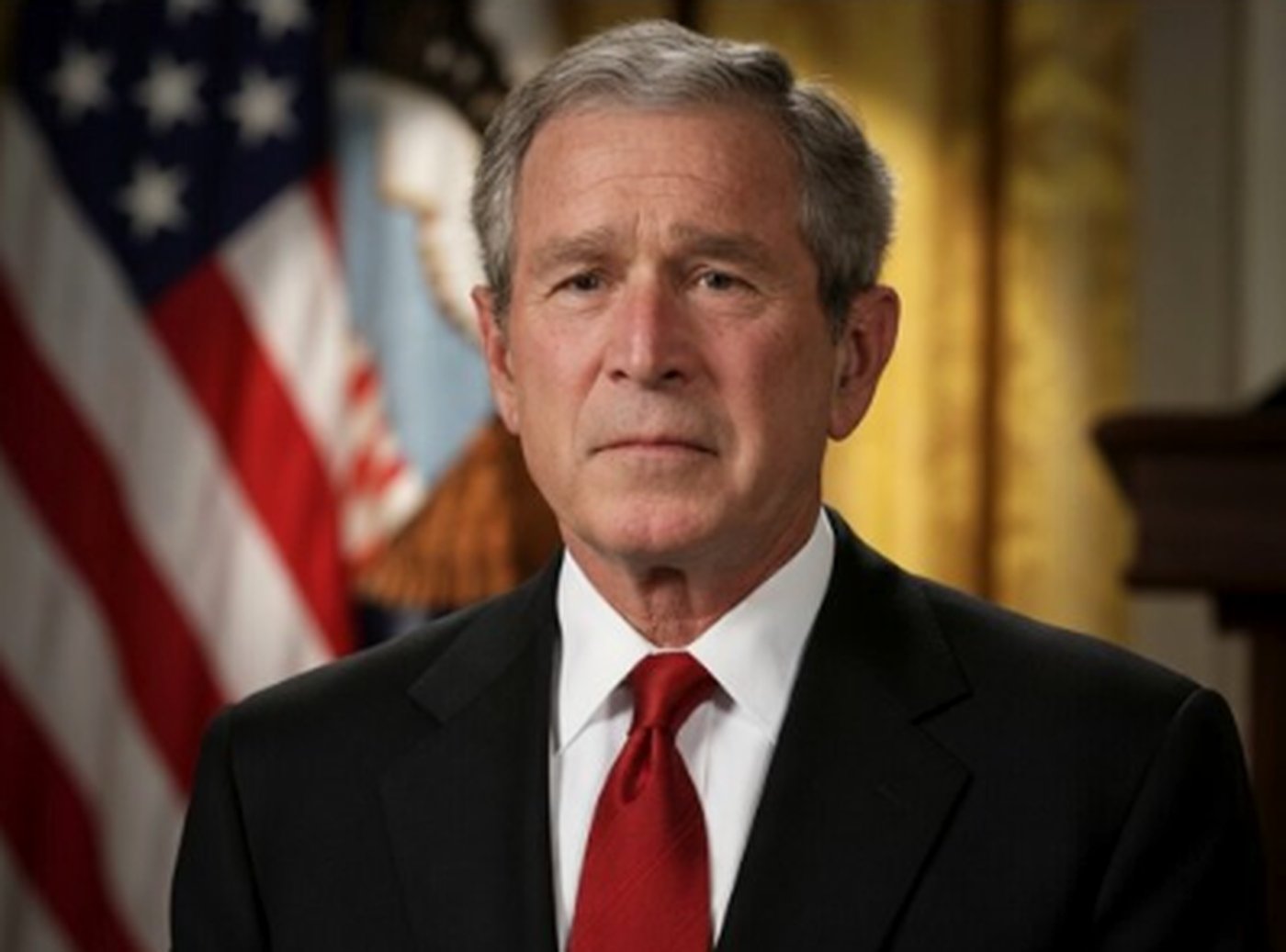 former President George W. Bush in dark suit and red tie stands before American flag with