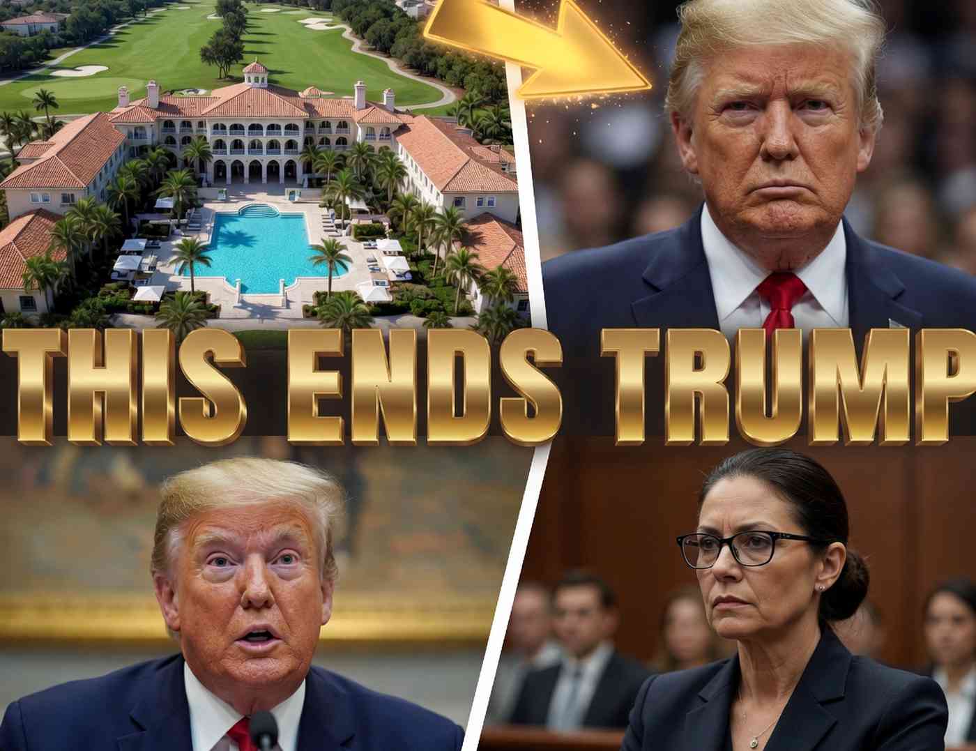 mar-a-Lago estate with Donald Trump in courtroom and press conference scenes, bold gold