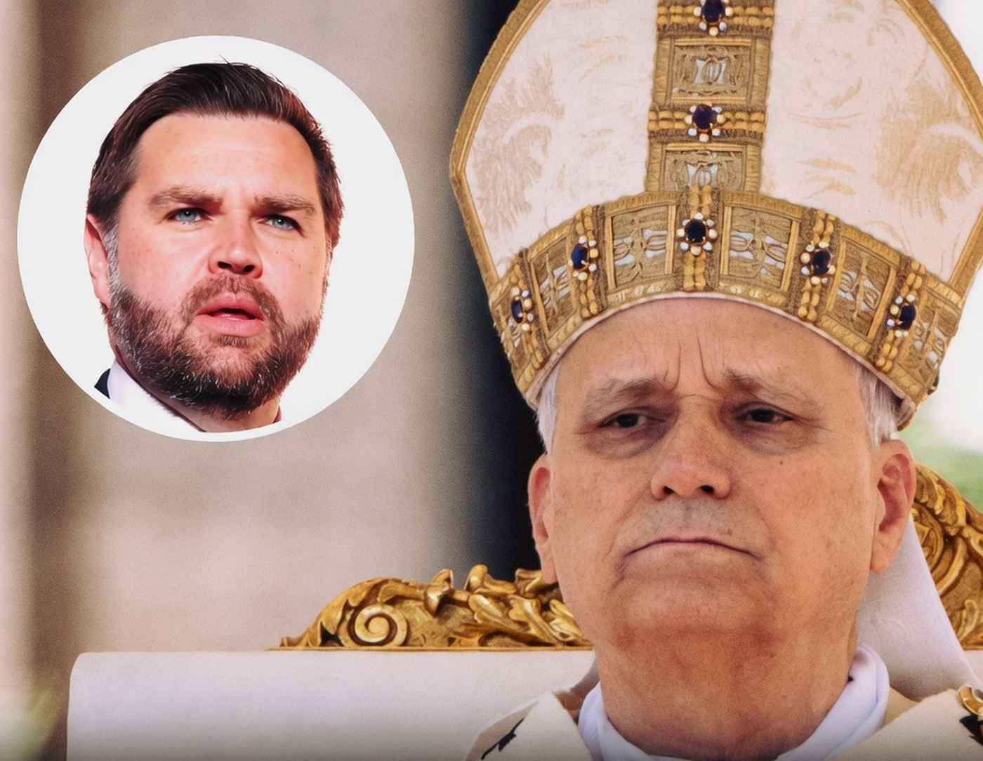 JD Vance inset portrait alongside Pope Leo XIV wearing ornate papal mitre with gold