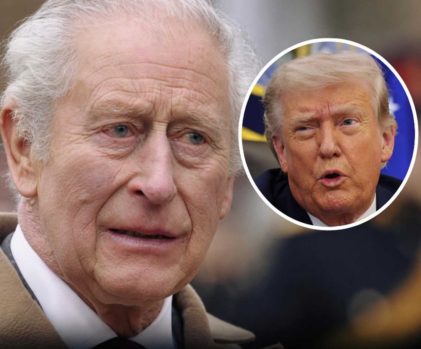 king Charles III portrait with Donald Trump inset image and headline about controversial