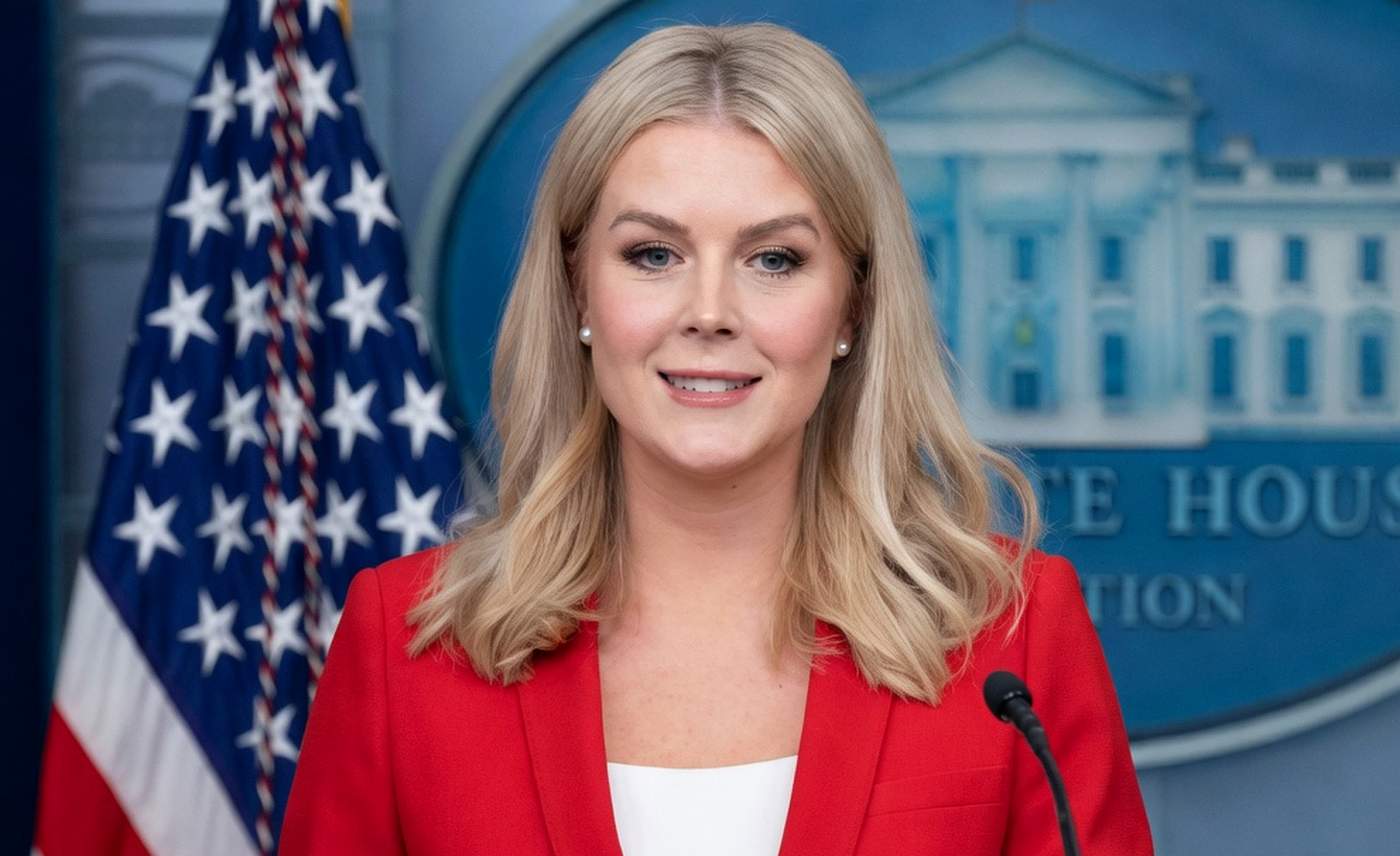 karoline Leavitt at White House press briefing podium wearing red blazer, American flag