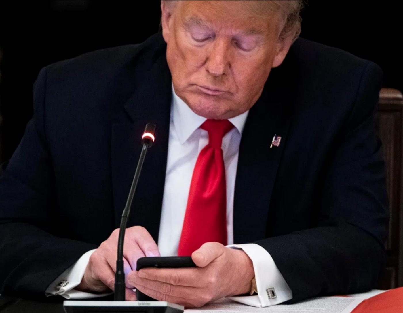 donald Trump in dark suit and red tie looking down at smartphone while seated at desk