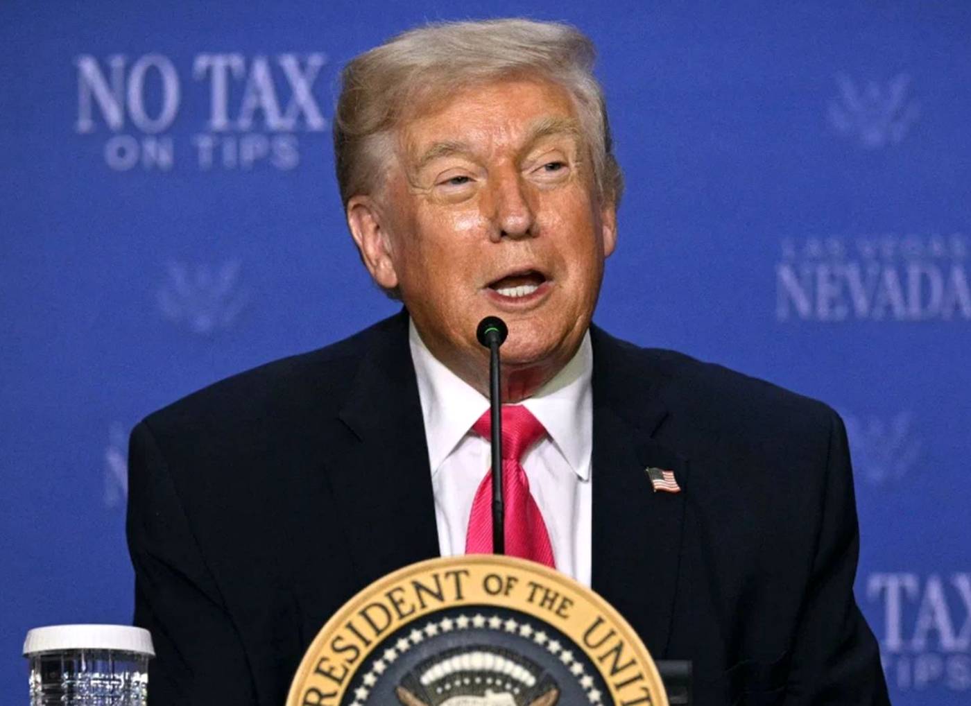 donald Trump speaks at a podium with the presidential seal, with NO TAX ON TIPS visible